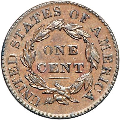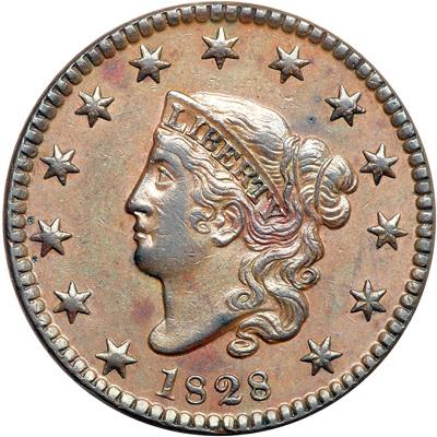 1828 N-10 R1. PCGS graded AU-55. Small Date. Frosty medium brown with darker steel brown toning on the highpoints and a couple small splashes of reddish brown toning on the obverse. No roughness or contact marks. Nicely struck E-MDS with repunching on the 1 and right top of the adjacent 8. Our grade is EF45.