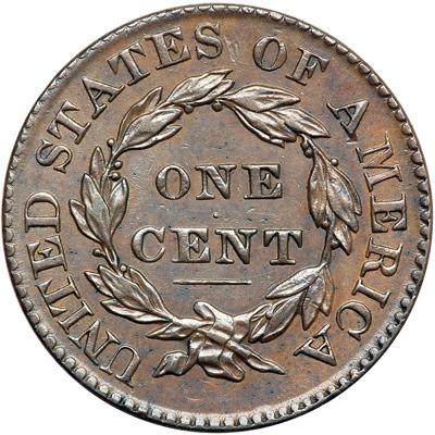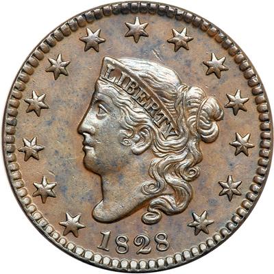 1828 N-10 R1. AU-50. Small Date. Glossy medium brown and light chocolate delicately mottled with darker olive and steel tones on the obverse. No marks or roughness. Nicely struck E-MDS with clear repunching on the 1 and right top of the first 8. Removed from an NGC slab graded MS62BN (NGC label included, and it shows the attribution and Reiver provenance).