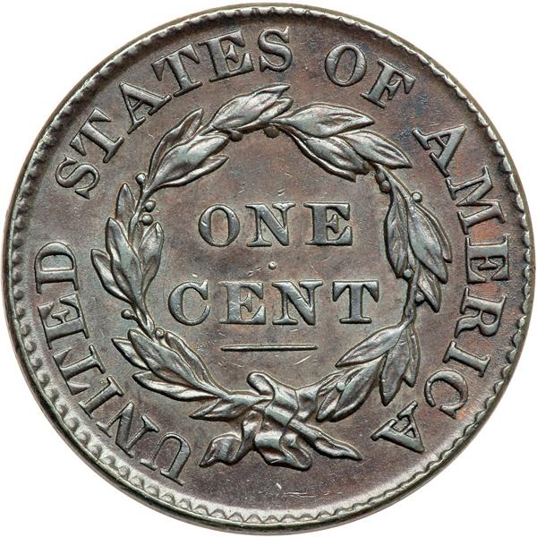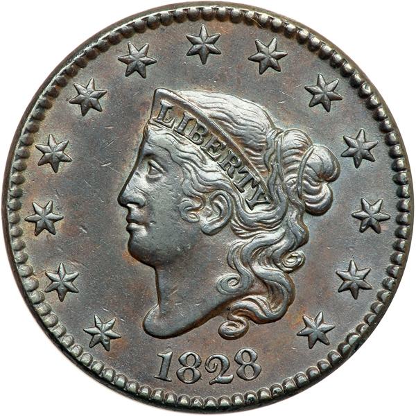 1828 N-11 R2 EF45+. EF-45+. Glossy chocolate brown with frosty bluish steel toning in protected areas. Excellent eye appeal for the grade. Close to AU50 but there is a dull rim nick at star13. LDS. Die wear and lapping have removed the misplaced S right of the D in UNITED and the misplaced O right of the second S in STATES. Removed from an NGC slab graded AU58BN (NGC label included, and it shows the attribution and Reiver provenance). DWH #2924.