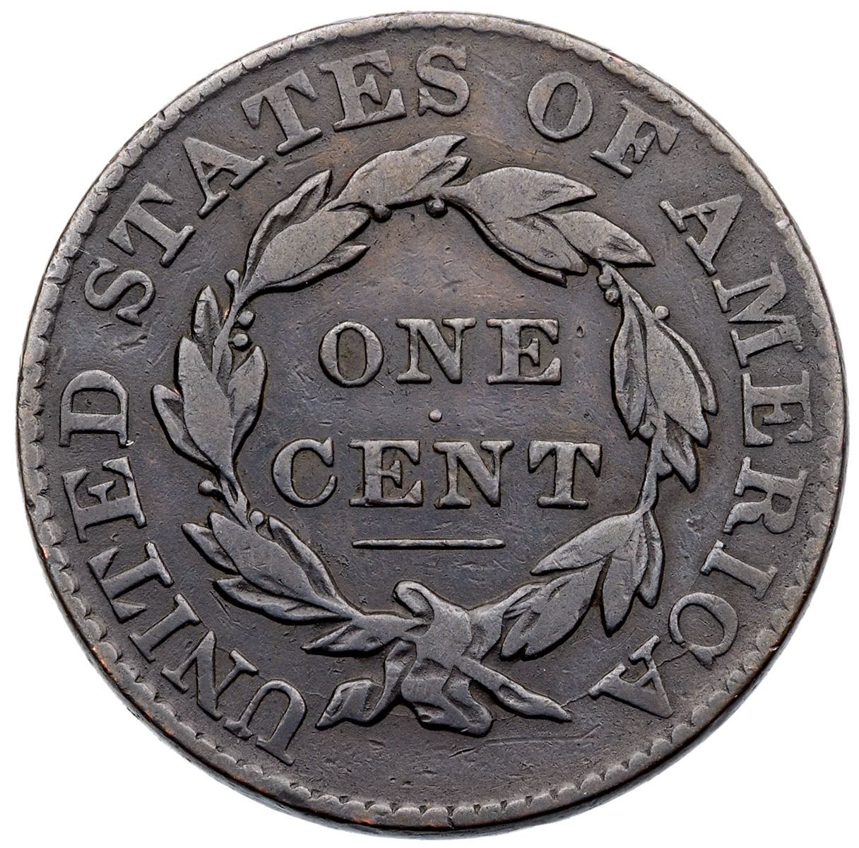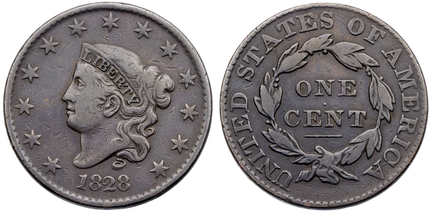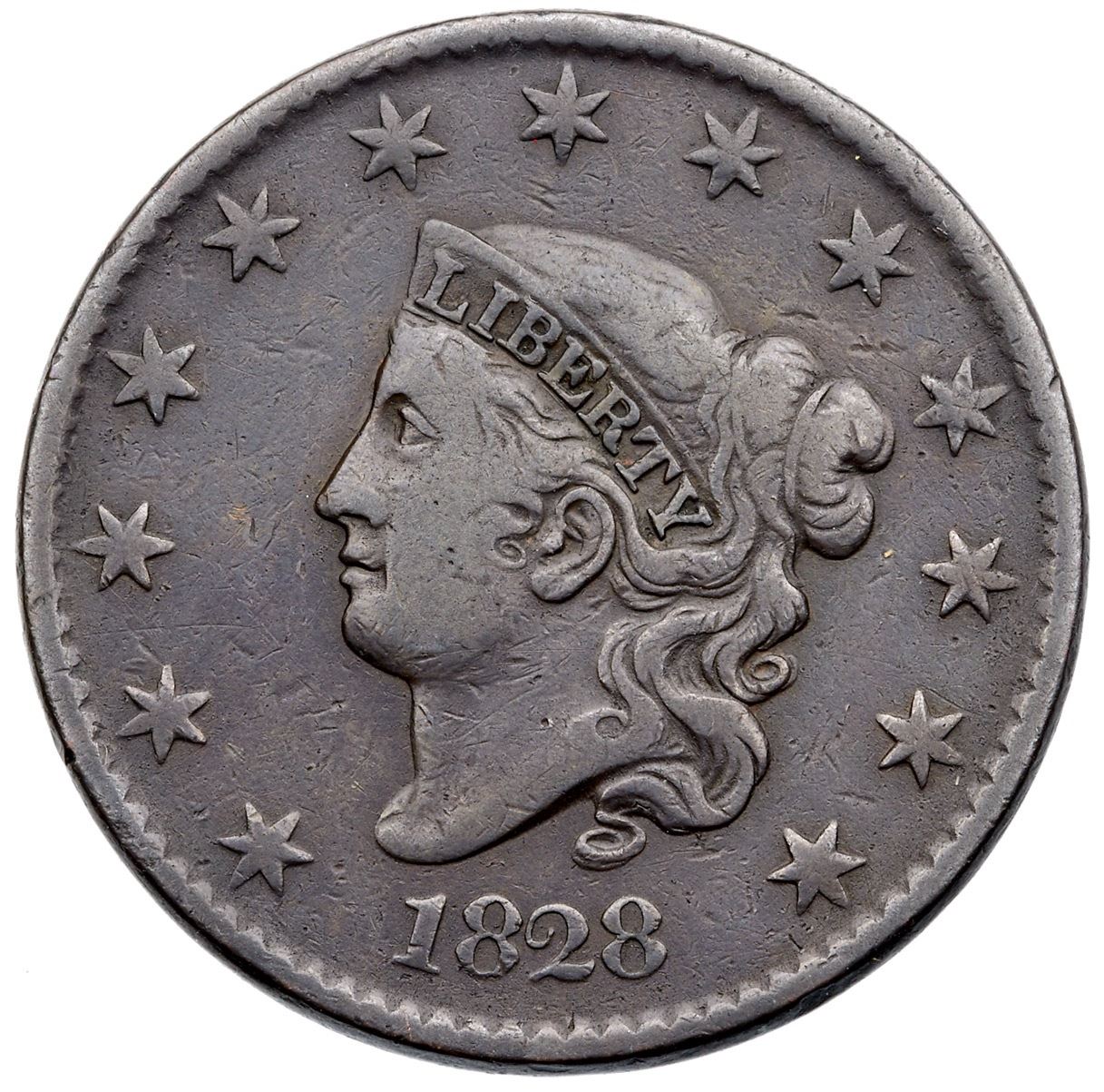 1828 N-12 R-3 F12Dark steel brown. Only the most trivial of marks consistent with the grade, a few wispy pin scratches on the neck the most notable. Smooth surfaces. Broken out of an ANACS F15 holder (#4861818), label included.Ex; Tom Reynolds