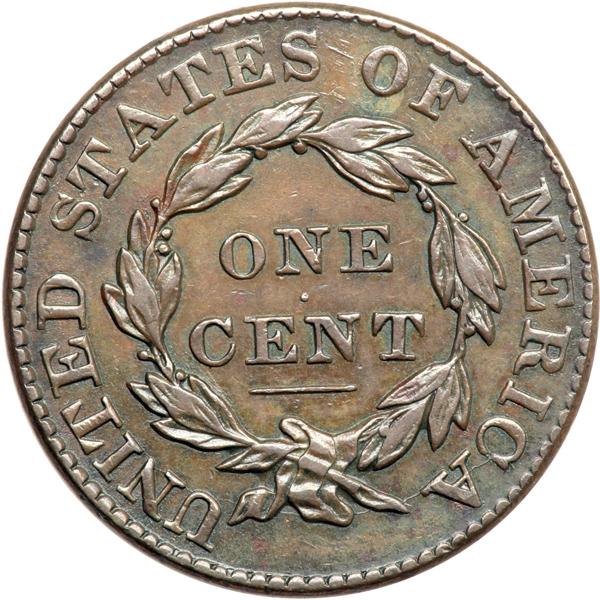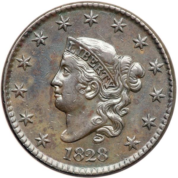 1828 N-12 R3+ VF35. Wright Plate Coin. VF-35. Glossy mix of chocolate, bluish steel, and light olive brown. The only notable mark is a microscopic planchet flake on a dentil at star 6. E-MDS. The reverse fields are smooth and slightly reflective and the parallel die lines at S-O are clear. Called VF35 and CC#2 among the confirmed examples in the Bland census. Noyes says EF40 net VF30 and tied for CC#5, his photo #28590. Plated in the Wright book to illustrate the die variety. An important cent that comes with a distinguished provenance. DWH #2466.