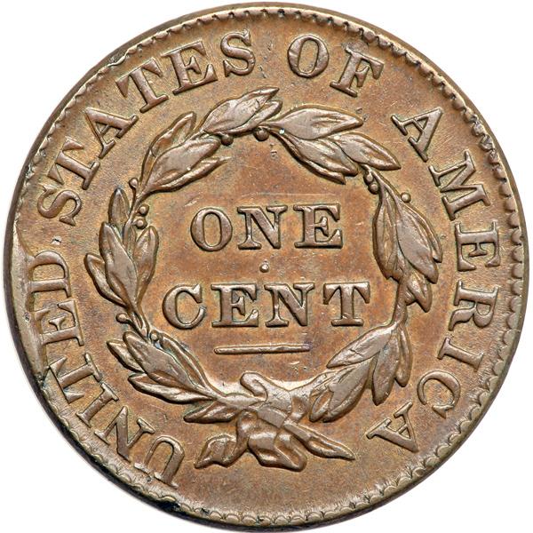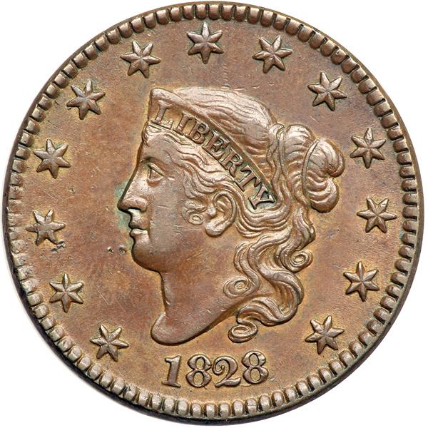1828 N-5 R2 EF40+. Finest Terminal Die State. EF-40+. Choice glossy medium brown with frosty golden light brown toning remaining in the protected areas. The only marks are two small pinpricks in the field off the chin and a tiny rim nick at the U in UNITED. Rare terminal die state with a strong cud break joining TED to the rim above. Near the lower end of the condition census for the variety but finest known of the terminal die state by a wide margin, the next best grading only VG10 or so. Called EF40 in the Noyes census, his photo #26739. Removed from an NGC slab graded AU58BN (NGC label included, and it shows the attribution and Reiver provenance). DWH #2923.