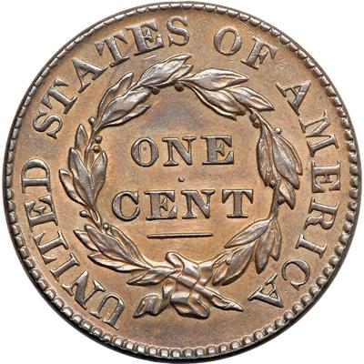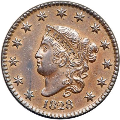 1828 N-6 R1. PCGS graded AU-58. Frosty tan with darker steel brown and chocolate toning on the devices. The only mark is a thin streak of darker toning up from star 1. MDS with a faint die crack from the bust tip to star 1 in addition to the usual tiny obverse lumps from die rust. Our grade is EF45.