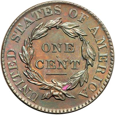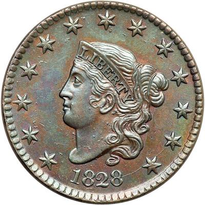 1828 N-6 R1 PCGS graded "Genuine". Glossy olive brown with underlying very faded mint color showing through, especially on the reverse. No defects, just a hint of friction on the highest points from mint state. Nicely struck MDS with a faint die crack from the bust tip to star 1 in addition to the always-present tiny lumps on the obverse from fine die rust. Our grade is AU55.