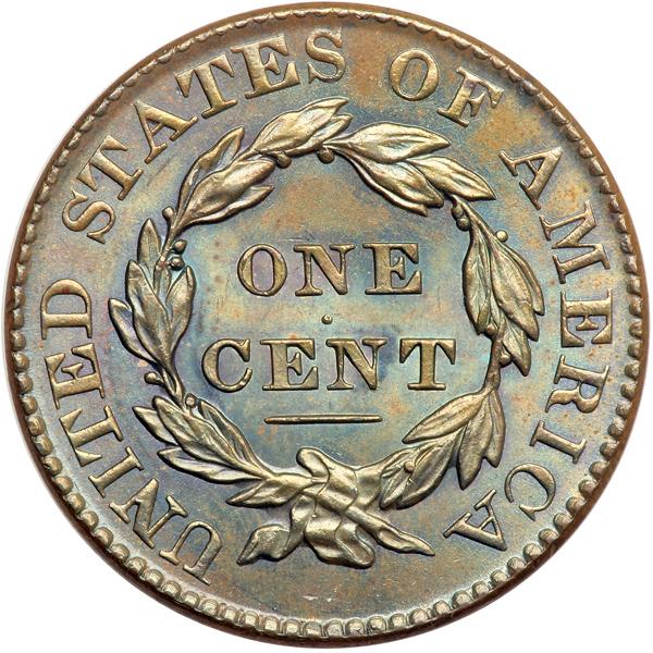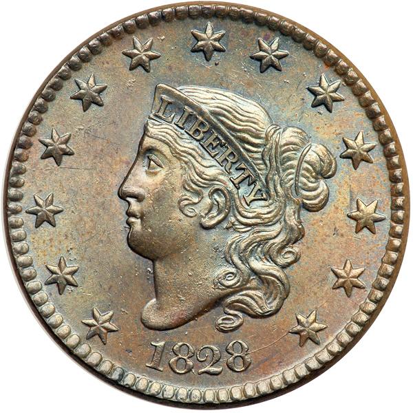 1828 N-6 R1. Partial Double Profile. PCGS graded MS-63 Brown. Lustrous light bluish steel brown with hints of underlying very faded mint red in protected areas of the reverse. A faint horizontal hairline under the right side of star 4 is the best identifying mark, but it is difficult to find any defects on this attractive cent. The reverse is choice. M-LDS. The crack from 28 to stars 13 & 12 is clear and additional faint die cracks show from the bust tip through star 1 to the dentils below and from the tip of the coronet through star 6 to the dentils. The obverse is peppered with tiny lumps due to fine die rust, as always. There is a double profile from die bounce on the forehead, nose tip, upper lip, and chin. Called MS60 and tied for CC#10 in the Noyes census, his photo #58224. Our grade is MS62. Pop 1; 2 finer in 64; 1 in 65. Only 3 graded at PCGS for the variety. DWH #2514 (PCGS # 36889) .