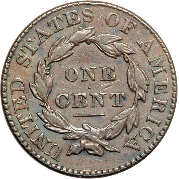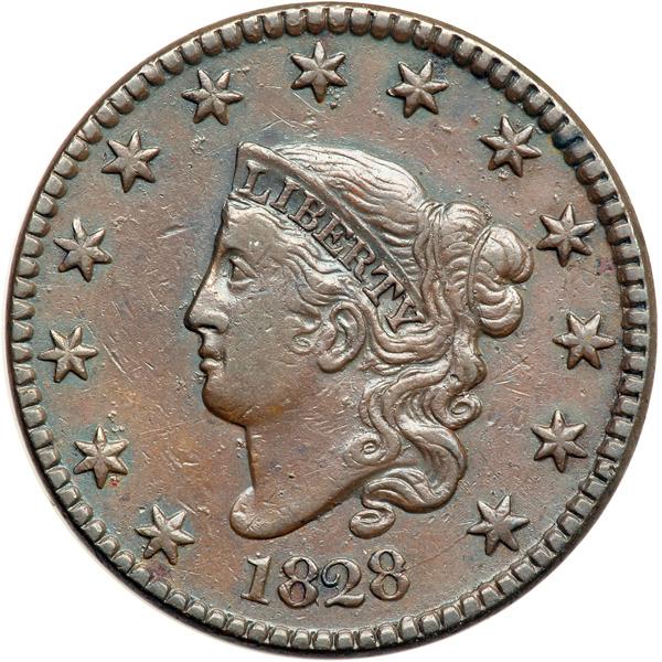 1828 N-6 R1 VF25+. VF-25+. Five points sharper with too many tiny nicks for the sharpness grade. The notable marks are a speck of reddish carbon at the dentils under star 1 and a pair of thin nicks under the E in ONE. EDS. The always-present die crack from the 28 to stars 13 & 12 is clear but the crack from the bust tip to star 1 has not formed. The reverse is rotated 10 degrees CCW. DWH #0672.