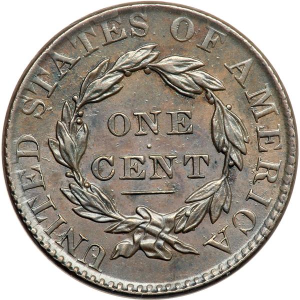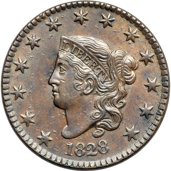 1828 N-7 R3. PCGS graded MS-63 Brown. Glossy chocolate brown delicately mottled with some lighter and darker tones with satiny mint frost covering the protected areas. The only mark is a tiny nick just right of the nostril. M-LDS with tiny lumps on both sides from die rust, strongest in the field before the portrait. Our grade is AU50. Pop 1, 2 finer; 1 in 65; 1 in 66. Only 4 graded at PCGS for the variety. DWH #2465 (PCGS # 36892) .