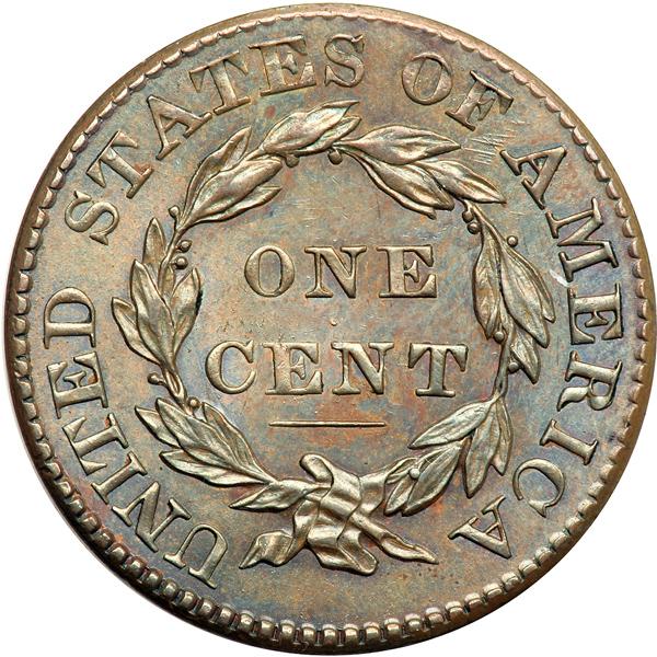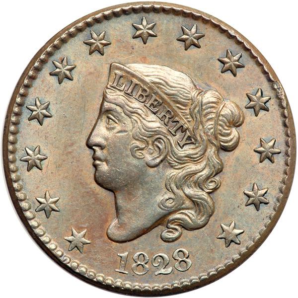 1828 N-9 R4 AU55. AU-55. Frosty light steel brown with golden tan in protected areas of the obverse and delicate overtones of lustrous bluish steel in protected areas of both sides, especially on the reverse. Just a trace of light friction on the highest points from mint state. The only marks are a small nick high on the cheek under the right corner of the eye and a dull mark in the dentils at star 10. EDS. The reverse fields are smooth and satiny and the diagonal die lines at F-A are sharp. Graded AU55 and tied for CC#3 in the Noyes census, his photo #34622. Called AU55 by Bland and in the lower half of his condition census for the die variety. Removed from an NGC slab graded MS61BN (NGC label included). Comes with a nice provenance. DWH #2605.