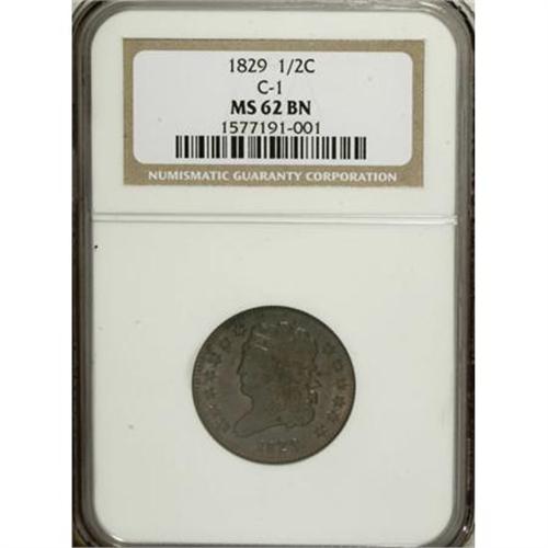 <B>1829 1/2 C MS62 Brown NGC.</B></I> C-1. NGC Census: (28/76). PCGS Population (23/56). Mintage: 487,000. Numismedia Wsl. Price for NGC/PCGS coin in MS62: $246. (#1153)<BR><BR><B>Coin Engraver:</B> John Reich<BR><BR><b>Shipping:</b> Coins & Currency (<a target="_blank" href="http://www.heritageauctions.com/common/shipping.php">view shipping information</a>)