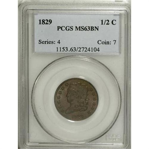 <B>1829 1/2 C MS63 Brown PCGS.</B></I> PCGS Population (28/28). NGC Census: (23/52). Mintage: 487,000. Numismedia Wsl. Price for NGC/PCGS coin in MS63: $352. (#1153)<BR><BR><B>Coin Engraver:</B> John Reich<BR><BR><b>Shipping:</b> Coins & Currency (<a target="_blank" href="http://www.heritageauctions.com/common/shipping.php">view shipping information</a>)