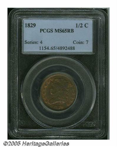 1829 1/2 C MS65 Red and Brown PCGS. B-1, C-1, R.1