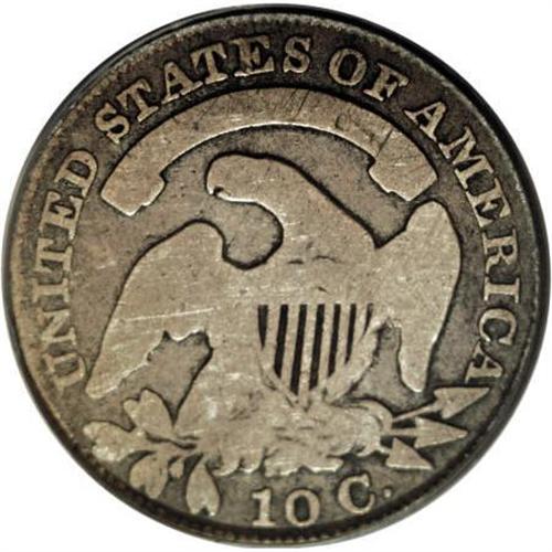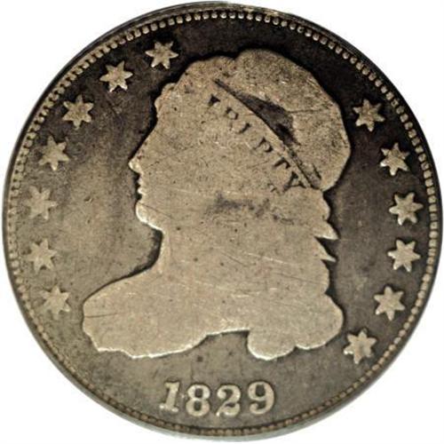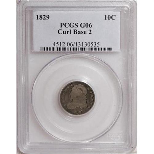 <B>1829 10C Curl Base 2 Good 6 PCGS.</B></I> JR-10, R.6. A legendary rarity in the Capped Bust dime series, the 1829 Curl Base 2 is unpriced in the 2008 Guide Book in grades above VF20. Although very rare regardless of grade, the variety is essentially unobtainable above Fine 12. This example is well worn, but the date and other peripheral legends are clear, and about half of LIBERTY is legible. E PLURIBUS UNUM is worn smooth. The portrait has a couple of thin vertical marks, visible only when viewed from selected angles.<BR><BR><B>Coin Engraver:</B> John Reich<BR><BR><b>Shipping:</b> Coins & Currency (<a target="_blank" href="http://www.heritageauctions.com/common/shipping.php">view shipping information</a>)