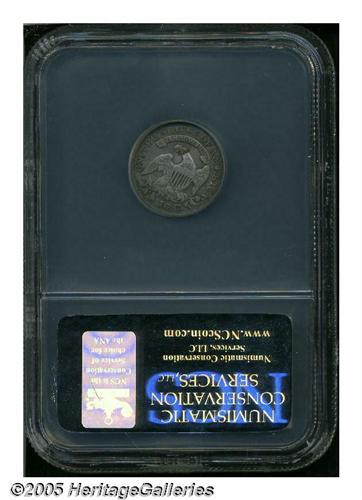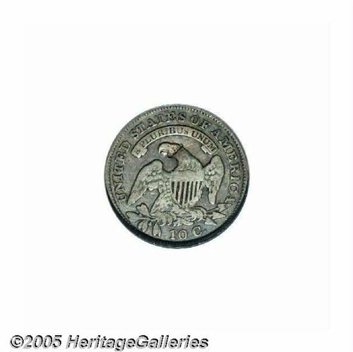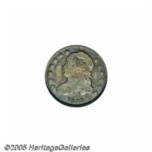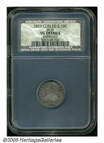 <B>1829<10C> Curl Base 2 VG Details, Damaged, NCS.</B></I> JR-10, R.6. The discovery specimen for this rare die marriage surfaced in a dealer's stock in Dayton, Ohio in 1973. The John Reich Society reports that the finest known example of JR-10 grades Fine 15. Although heavily worn, excellent detail remains on this smooth surfaced example. True, there is a noticeable intrusion across the eagle's neck, but the remainder of the coin is virtually unabraded. Both sides are richly toned in steel-gray shades that deepen a little on the reverse. A significant bidding opportunity for the Capped Bust Dime specialist.