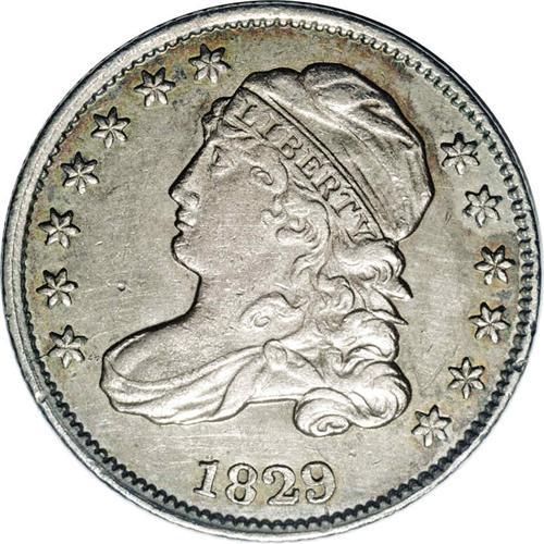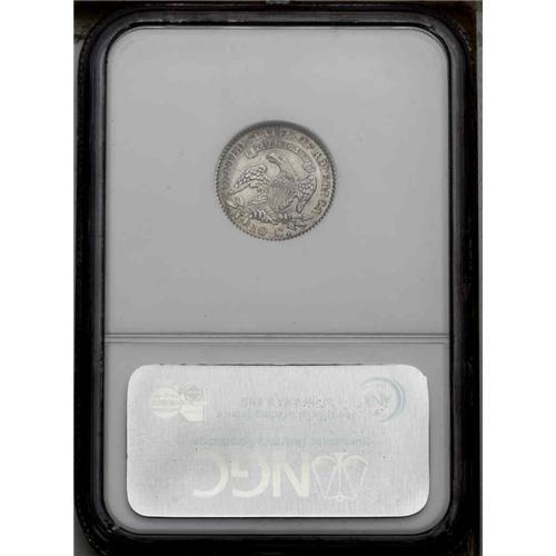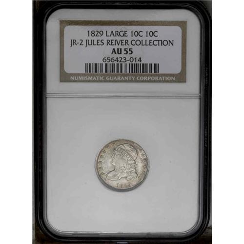 <B>1829<10C> Large 10C JR-2, R.2. Reiver state b. AU55 NGC.</B></I> A well struck coin that has bright silver on Liberty with gold and russet peripheral toning on the obverse and reverse. The surfaces are minutely granular. A die crack is seen on the obverse through the first star toward Liberty's neck, another through the 9, on the reverse a minor crack from the upper pair of olive leaves to the rim and another to the first T of STATES.<BR><I> No pedigree information included.</B></I> Envelope Included.
