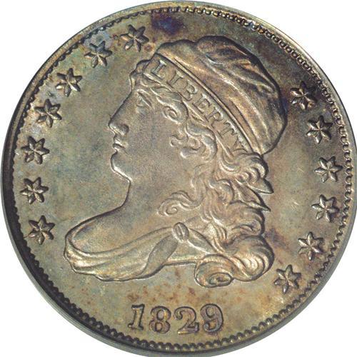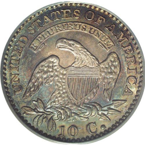 <B>1829<10C> Large 10C MS65 PCGS.</B></I> JR-2, R.2. Star 7 points to a curl on this variety, and there are doubled denticles between stars 3 and 4 and over star 9. The scroll begins under the left edge of the upright of the D in UNITED and ends under the left edge of the right leg of the M in AMERICA. A die crack runs from the rim beneath star 1 to the bust, while another branch runs to the upper serif of 1 in the date. Another runs from the rim through the base of the 9 to the lower curl. The lovely original patina is amber, copper, russet, and ocean-blue, with fuchsia added on the reverse. Delectable and collectible!