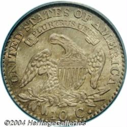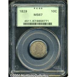 <B>1829<10C> Large 10C MS67 PCGS.</B></I> JR-2, R.2. This variety is attributed by the following: double denticles between stars 3 and 4 and over star 9; star 7 points to the curl; scroll begins under left edge of upright of D in UNITED, and ends under left edge of right leg of M in AMERICA; and the left leg of the foregoing M is weak. The present example is nicely centered, and sharply impressed on all of the design elements. Medium gray toning adheres to the devices, and competes with reddish-gold and green coloration in the fields. As a pedigree identifier, one small, trivial mark is noted in the field just to the left of the eagle's beak. <BR><BR><B>Important notice:</B> Heritage usually auctions material at the rate of 200-250 lots per hour. On some occasions eBay Live bid software or the Internet may not be able to keep up with the pace of the auction. We recommend placing a realistic absentee bid now as insurance to avoid disappointment. Occasionally the auctioneer may eliminate or reject an eBay Live bid, and the auctioneer may also reopen a lot after the close of the eBay live bidding (usually because we missed an audience bid), and may reject your bid even if it shows you as the winning bidder. By bidding via eBay Live, you agree that Heritage may award the lot to another bidder at its sole discretion under the circumstances described above or any other reasonable circumstances. Since eBay bids are not shown to us until we open the lot on the floor, we treat those bids just like floor bids. In most cases the floor responds before the eBay bid is presented to us, due to Internet lag time, so for consistency we have made it a policy that floor bids are always considered first over tie eBay live bids. Also please note that all Heritage lots purchased through eBay Live carry a 20% Buyer's Premium. Please make sure you read the Terms and Conditions before you bid. </span></font></tr></table></td></tr></table>