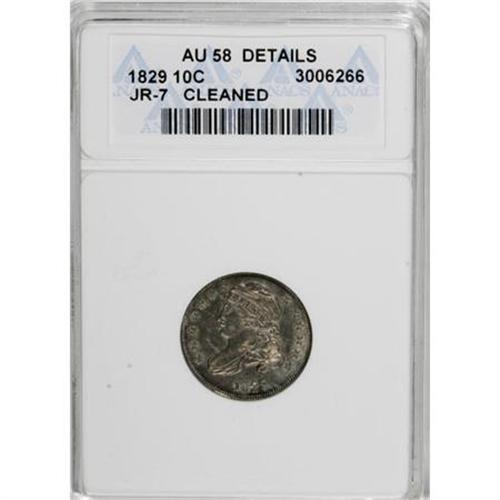 <B>1829 10C Small 10C--Cleaned--ANACS. AU58 Details.</B></I> JR-7. NGC Census: (33/137). PCGS Population (18/124). Mintage: 770,000. Numismedia Wsl. Price for NGC/PCGS coin in AU58: $383. (#4511)<BR><BR><B>Coin Engraver:</B> John Reich<BR><BR><b>Shipping:</b> Coins & Currency (<a target="_blank" href="http://www.heritageauctions.com/common/shipping.php">view shipping information</a>)