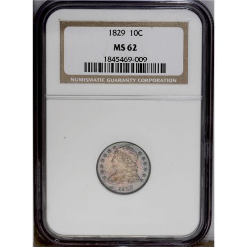 <B>1829<10C> Small 10C MS62 NGC.</B></I> JR-7, R.1. Cherry-red centers are framed by aqua-blue margins. This boldly struck type coin displays a few wispy handling marks in the fields, but luster is bright and extensive.