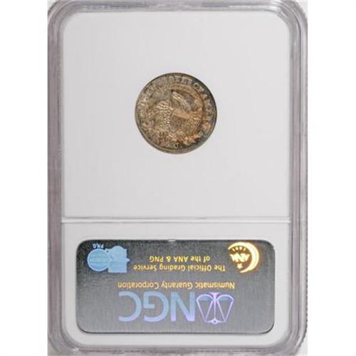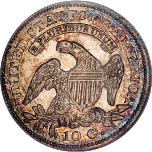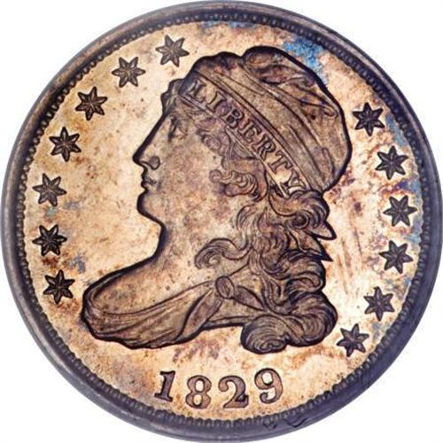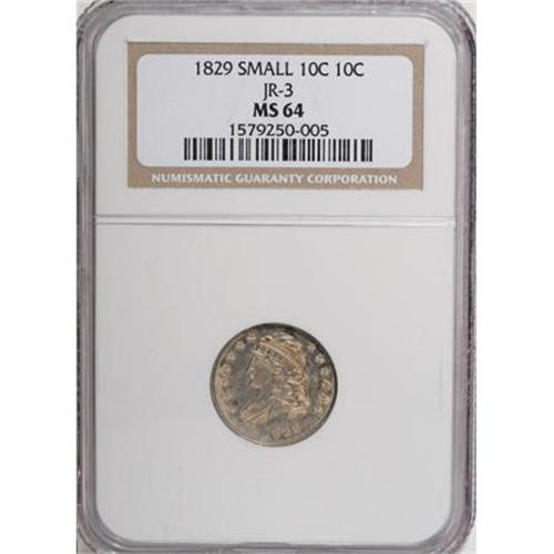 <B>1829 10C Small 10C MS64 NGC.</B></I> JR-3, R.4. This lovely near-Gem is generally light sun-gold, although the borders possess ocean-blue toning. Precisely struck and satiny with a splendidly undisturbed appearance. The vertical shield lines are merged, typical for the variety. JR-3 is among the more difficult 1829 marriages.<BR><BR><B>Coin Engraver:</B> John Reich<BR><BR><b>Shipping:</b> Coins & Currency (<a target="_blank" href="http://www.heritageauctions.com/common/shipping.php">view shipping information</a>)