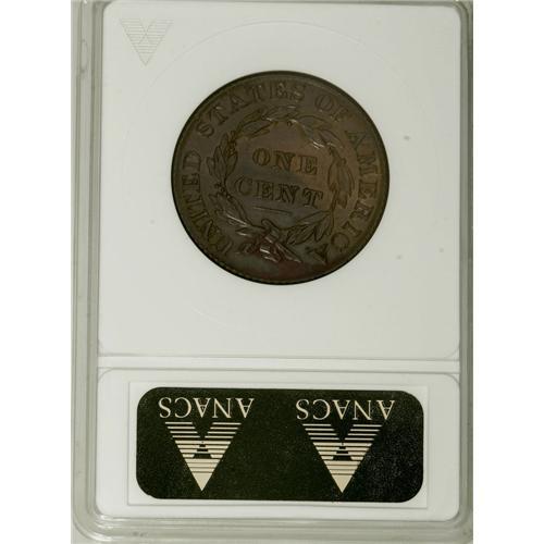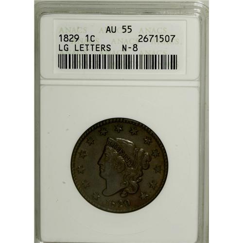 <B>1829 1C Large Letters AU55 ANACS.</B></I> N-8, R.1. Noyes Die State B with obverse rim crumbling. The obverse is medium brown, and the reverse is about evenly divided into golden-brown and mahogany. Faint hairlines are found beneath CENT. EAC 45.<BR><BR><b>Shipping:</b> Coins & Currency (<a target="_blank" href="http://www.heritageauctions.com/common/shipping.php">view shipping information</a>)
