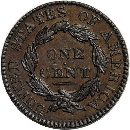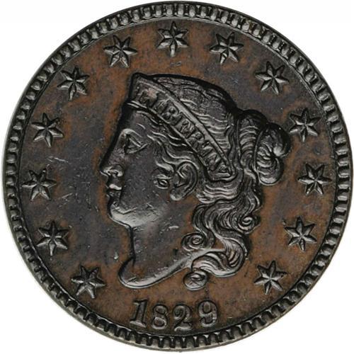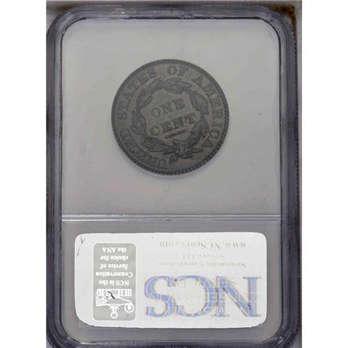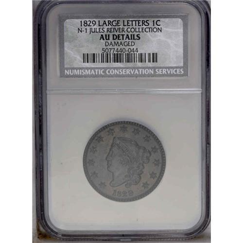 <B>1829<1C> Large Letters. N-1, R.3--Damaged--NCS. AU Details. XF45 EAC.</B></I> The T in LIBERTY is widely recut west, and the leaf tip extends past the second S in STATES. This sharp representative possesses two-tone ebony and golden-brown colors. Several small marks on the face and left obverse field are strictly assessed by NCS. The wreath and the O in ONE also have marks of lesser interest.<BR><I>Ex: Coin Gallery (8/1956), lot 2300; Carter; Del Bland (4/23/1970).</B></I> Envelope Included.