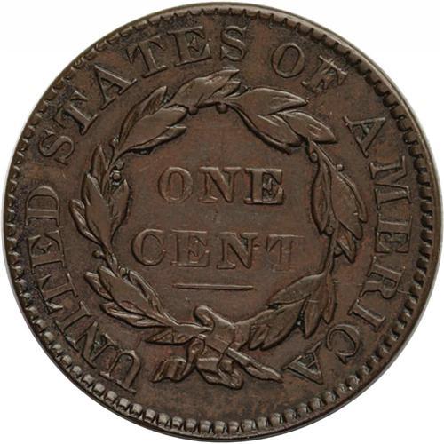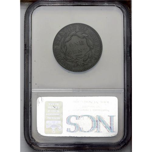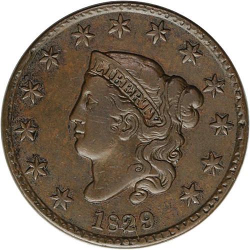 <B>1829<1C> Large Letters. N-4, R.4--Environmental Damage--NCS. VF Details. VF20 EAC.</B></I> Middle Die State. Minor verdigris outlines design elements, most noticeable near the stars. Medium brown color is consistent throughout both sides. Faint parallel marks on the cheekbone and the F in OF, otherwise smooth for its circulated status. Dies are lightly rotated counterclockwise.<BR><I>Ex: Ron Cooper (3/1/1968).</B></I> Envelope Included.