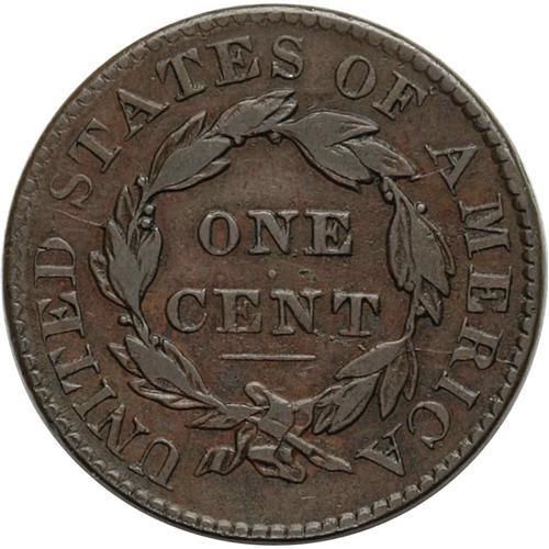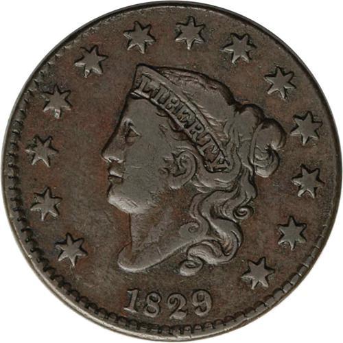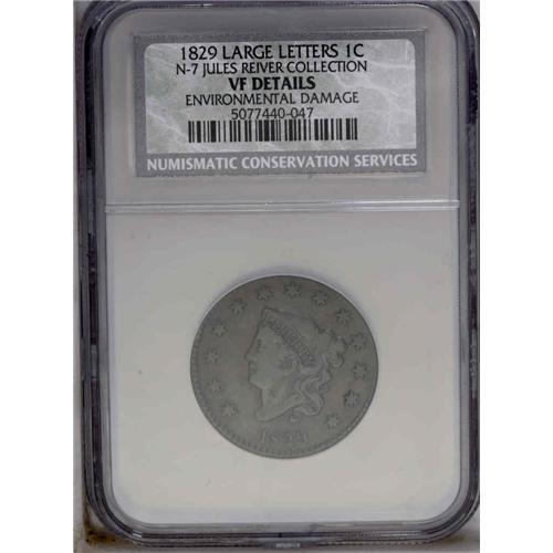 <B>1829<1C> Large Letters. N-7, R.3--Environmental Damage--NCS. VF Details. Fine 12 EAC.</B></I> The 'Wheelspokes' variety, with all 'spokes' present, although the die crack between the wreath and the second T in STATES is faint. The gray-brown surfaces are moderately granular, but contact marks are minimal. A collectible example of this distinctive variety.<BR><I>Ex: Lester Greenwood Carter, Mason-Dixon (6/1956), lot 40; Del Bland (3/31/1970).</B></I> Envelope Included.