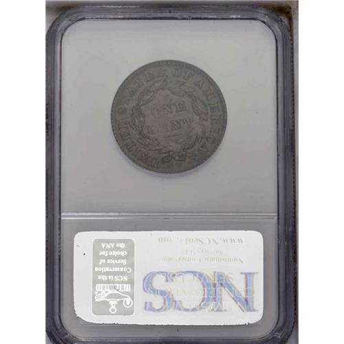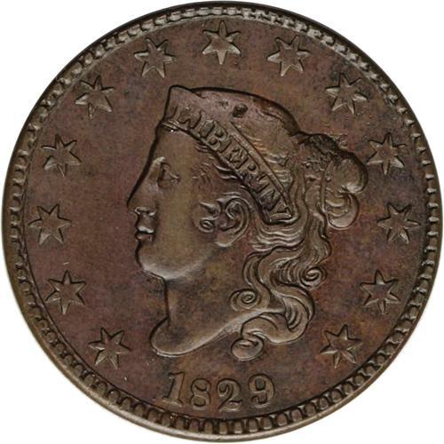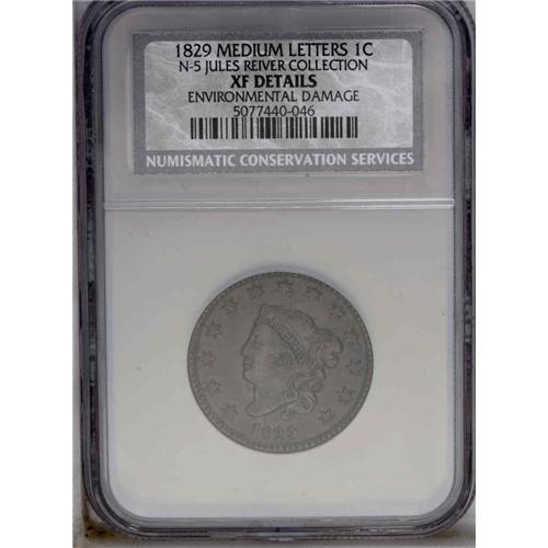 <B>1829<1C> Medium Letters. N-5, R.3--Environmental Damage--NCS. XF Details. VF30 EAC.</B></I> A bluntly struck golden-brown example that shows die crumbling on the dentils near stars 3 to 5. Pitting is seen on the top of the hair bun and on the field above the N in ONE, but no other corrosion requires mention. A small recessed area within the hair is possibly as made. Newcomb-5 typically is encountered with a miserable strike; softness on such elements as the E in CENT and the stars should not be confused with wear.<BR><I>Ex: George Ramont (5/10/1971).</B></I> Envelope Included.