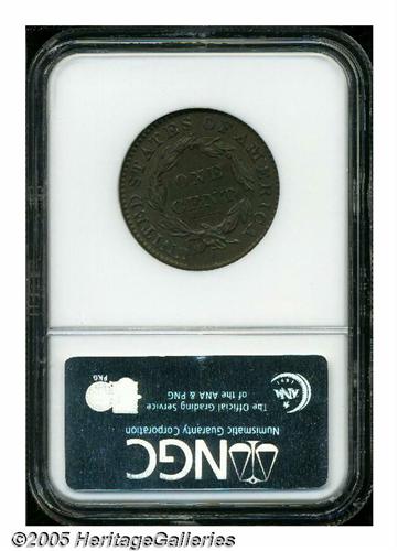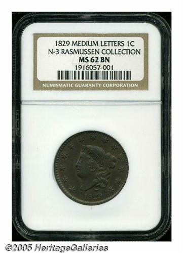 <B>1829<1C> Medium Letters MS62 Brown NGC.</B></I> N-3, High R.3. Ex: Rasmussen Collection. This variety is almost always found bluntly struck. As a result, just a touch of wear yields the appearance of a middle or lower grade coin. The Condition Census, therefore, is lower than would be expected for a variety of this rarity. This example has a very sharp strike, unusually so for the variety, and is among the finest known. It is approximately equal to the Jack Robinson coin (called third finest) in terms of actual grade, but far finer overall with a much sharper strike. Both sides have full and crisp border details. The surfaces are smooth and attractive with olive-brown color accented by lighter tan around the devices. The obverse has a die crack through the first four stars on left and the last three on the right. On the reverse, the tops of all three As are partially or completely filled.<BR><I>Ex: Stack's (10/78), lot 617; Roy Harte Collection (Bowers and Ruddy, 1/83), lot 589.</B></I>