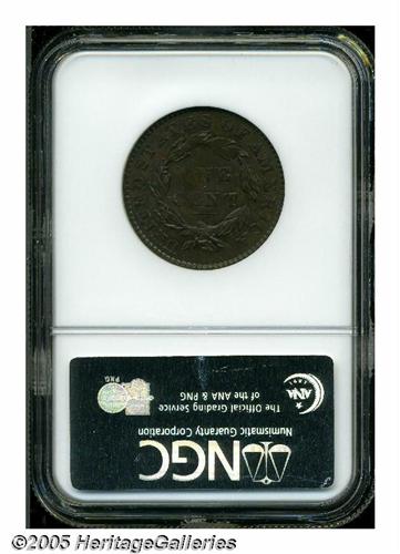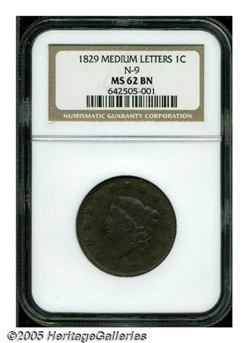 <B>1829<1C> Medium Letters MS62 Brown NGC.</B></I> N-9, R.4. A satiny and smooth golden-brown and mahogany Cent, limited in grade by a soft strike, characteristic of the scarce variety. A faint spot near the mouth does not distract.