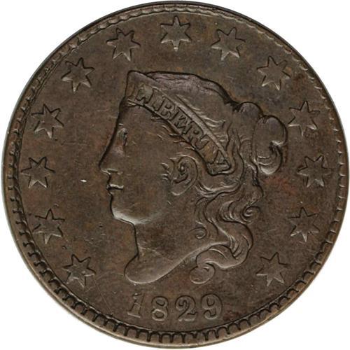 <B>1829<1C> Medium Letters. N-9, R.4--Reverse Corroded--NCS. VF Details. Fine 12 EAC.</B></I> N-9 is a scarcer variety, and it is also distinctive as it is the sole marriage that pairs the Medium Letters reverse with a Small 1 in the date. Late dies with a lengthy arc-shaped crack between stars 4 and 12, and a less dramatic crack that connects the initial three stars. A granular patch partly includes the C in CENT, the obverse field also shows a hint of pitting, and the central reverse field has light brush marks.<BR><I>Ex: Hillcrest (9/24/1968), lot 89.</B></I> Envelope Included.
