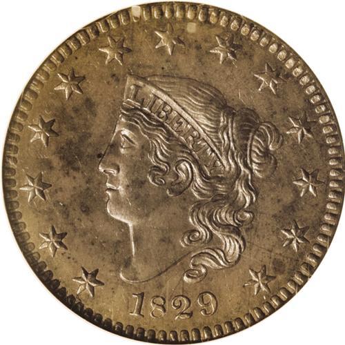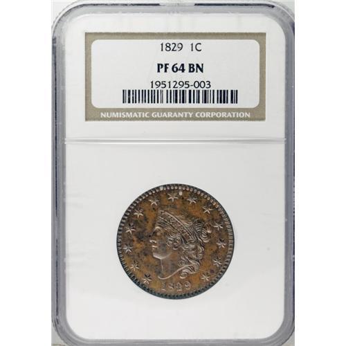 <B>1829 1C PR64 Brown NGC.</B></I> N-6, Low R.7 as a proof. The 1829 N-6 is readily secured as a business strike, but proofs are extremely rare. Walter Breen, in his 1988 <I>Complete Encyclopedia of U.S. and Colonial Coins,</B></I> states under Breen-1841, "at least 6 proofs of N-6." A few years earlier, in his <I>Encyclopedia of United States and Colonial Proof Coins,</B></I> he pedigreed seven examples, with the Brand specimen (#7) listed as possibly the same as the Beckwith example (#2). Eliasberg, of course, used a proof to represent the 1829 cent within his legendary "complete" collection. The Bowers and Merena catalog description for that piece states, "Perhaps 10 proofs are known of this variety, in the cataloger's opinion, although John Wright suggests 12 to 16."<BR> Heritage has not auctioned an example in proof format, dating back to 1991 when our archived records begin. In the approximately 20 years of operation of NGC and PCGS, the services have encapsulated a total of 12 proofs for the 1829, which presumably are from N-6 dies. Most of these pieces were bronzed at the Mint. Breen states this technique involves coating a planchet or a struck example with bronzing powder and baking it. This technique was used mostly on 19th century Mint medals, although some proof patterns, half cents, and cents were also bronzed. The present example does not appear to be bronzed, and in fact shows traces of the original orange-gold color, particularly on the reverse legends and wreath. The strike is sharp aside from stars 6 to 9, consistent with the Breen's comment that "all proofs have the top four stars weak." Star 8 is repunched, which helps identify this Large Letters variety. The dies are rotated counterclockwise perhaps 30 degrees, and the only relevant imperfections are a couple of wispy marks near the NT in CENT. The fields are nicely mirrored. The proof 1829 is the foremost large cent rarity of the date, and would be a centerpiece of even the most advanced holding of middle date large cents. EAC PR60.<BR><BR><b>Shipping:</b> Coin/Currency (<a target="_blank" href="http://www.heritageauctions.com/common/shipping.php">view shipping information</a>)