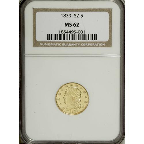 <B>1829 $2 1/2 MS62 NGC.</B></I> Breen-6132, BD-1, High R.4. Only 70 to 90 examples of this date survive, according to John Dannreuther, thus examples are not easily located in any grade. Typically, survivors are found in the AU and low Mint State grades, through about MS64. While most were melted by bullion dealers, others were retained by individual collectors and hoarders, thus these coins never actually circulated. This piece is fully lustrous with bright yellow gold surfaces. Parallel adjustment marks cross the shield at the center of the reverse. Census: 9 in 62, 11 finer (4/07).<BR><BR><b>Shipping:</b> Coins & Currency (<a target="_blank" href="http://www.heritageauctions.com/common/shipping.php">view shipping information</a>)