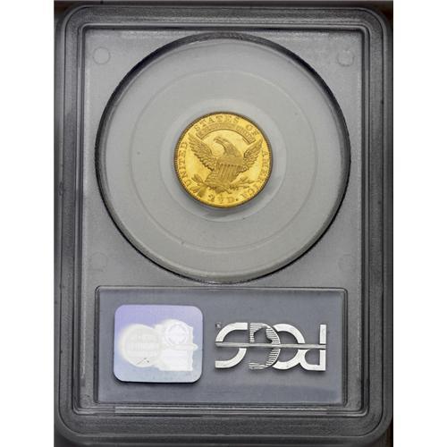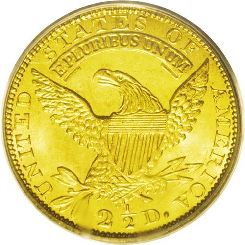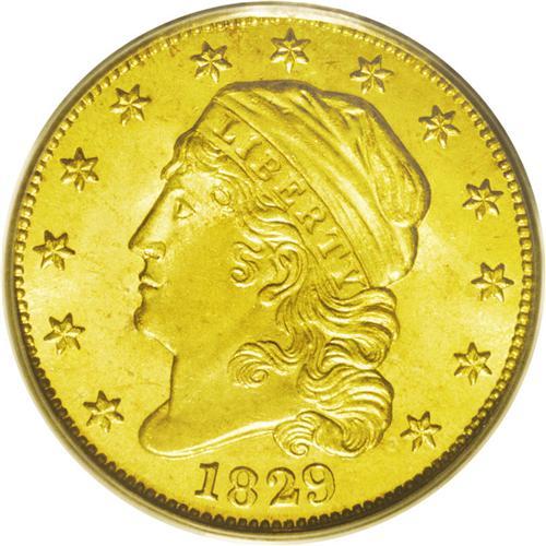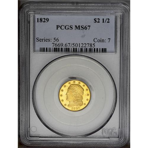 <B>1829<$2 1/2> MS67 PCGS.</B></I> Breen-1, Breen-6132, Bass-3026, R.4. William Kneass modified the quarter eagle design this year, perhaps specifically to mark introduction of the close collar among coins of this denomination. The diameter of the quarter eagles was reduced slightly, to 18.2 mm., and it was this slight reduction that drove the design modification. Smaller stars were employed on the obverse, and the rims were changed to use a beaded border with a high plain rim, an advancement that protected much of the surface of the coin from wear and nicks. The stars and date were each punched into the die by hand, one at a time, thus exhibit slight variance in their relative position. In the date, for example, the digit 8 is slightly low in relation to the other numerals. The three stars at the top, trapped between the top of Liberty's cap and the border, appear to be slightly closer in relation to each other than the remaining stars. The reverse was similarly modified, especially in the treatment of the border. Individual letters in the statutory legend appear to be entered by hand, again, one at a time. This reverse die was only used in 1829, with further modifications for the 1830 reverse, which remained in use through the end of the series.<BR> Today these coins, struck from 1829 through 1834, are among the rarest of U.S. coin types. During this period, just over 25,000 coins were struck. Many if not most were melted, some in the year of issue, as their bullion value was higher than their face value. Beginning after the War of 1812, effectively starting in 1815, and continuing until implementation of the Act of June 28, 1834, gold coins were only available at a premium. Thus, the few collectors of those days could not pull examples from circulation, but had to buy them from bullion dealers.<BR> These were the first quarter eagles struck with the new "close collar"