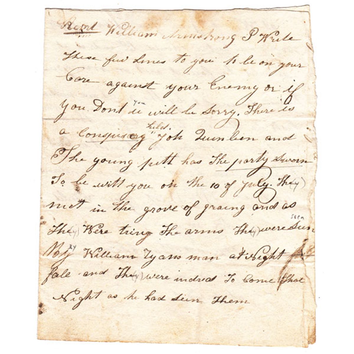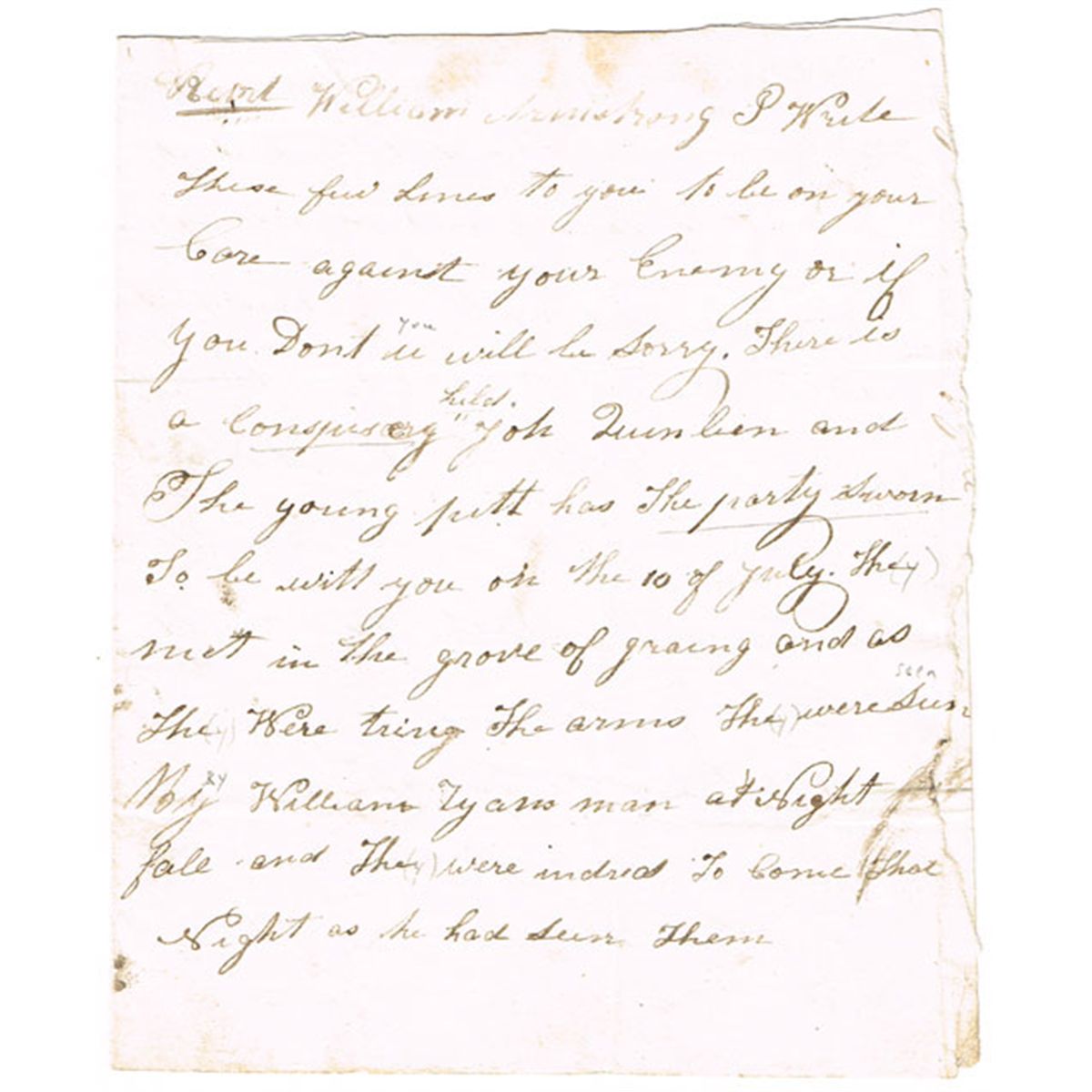 A collection of fascinating letters sent to Rev. William Armstrong of Mealiffe, near Thurles regarding the collection of tithes in County Kilkenny. Including an unsigned, undated letter postmarked Thurles, warning Armstrong of a conspiracy to plunder his residence on 10 July. "These few lines to you to be on your care against your enemy or if you don't you will be sorry... look to this in time, before the harm is done and before the harvest is cut down... be on your guard against bad fellows, you are near trouble at present". Also letters from tithe-proctor, James Pringle, referring to local unrest, intimidation and death threats and a document describing severe intimidation of tithe process-servers at Clogheen, County Tipperary. (7 items)