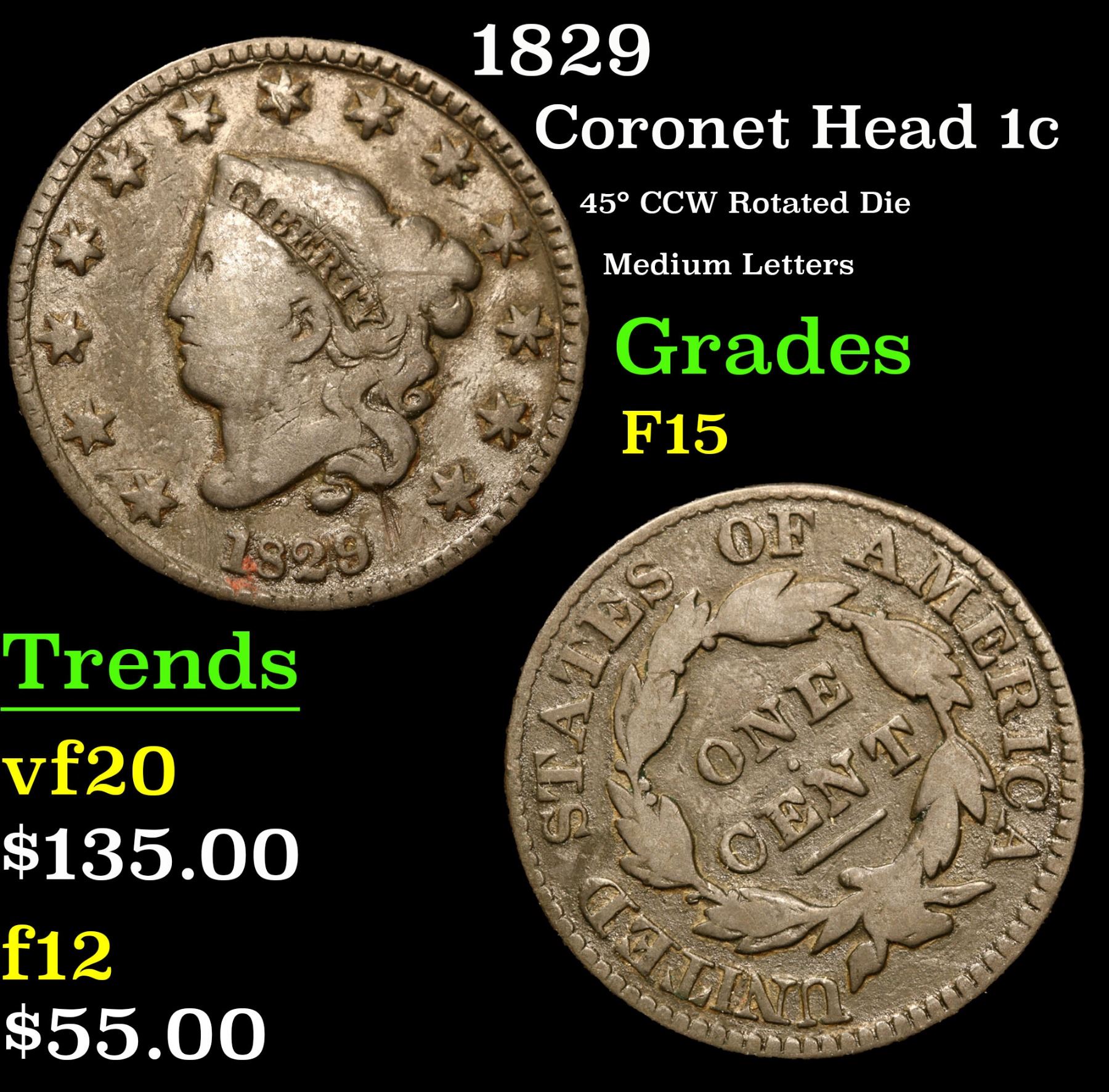 1829 45¡ CCW Rotated Die Medium Letters Coronet Head Large Cent 1c Grades f+.