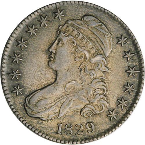 <B>1829<50C> Small Letters--Improperly Cleaned--NCS. AU Details.</B></I> O-114, R.3. Both As in AMERICA are filled at the tops. Even close examination fails to disclose any signs of obvious cleaning as alluded to on the NCS holder. Both sides are a deep, steel-gray color and minimal wear is seen on the highest points. Worth a close look.<BR><I>Ex: Fred Borcherdt (12/13/1980).</B></I> Envelope Included. <BR><BR><B>Importa