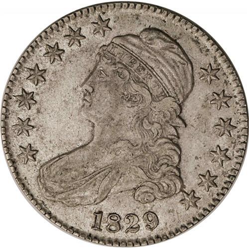 <B>1829<50C> Small Letters AU50 NGC.</B></I> O-113a, R.2. The second A in AMERICA is filled at the top, diagnostic of the O-113a variety. A lightly circulated example of this more available variety, and later die state. A coating of medium, mottled steel-gray toning lends originality to both sides. A few degrees of counterclockwise die rotation is also noted.<BR><I>Ex: Coin Galleries (11/1984), lot 1627.</B></I> Envelope Included.