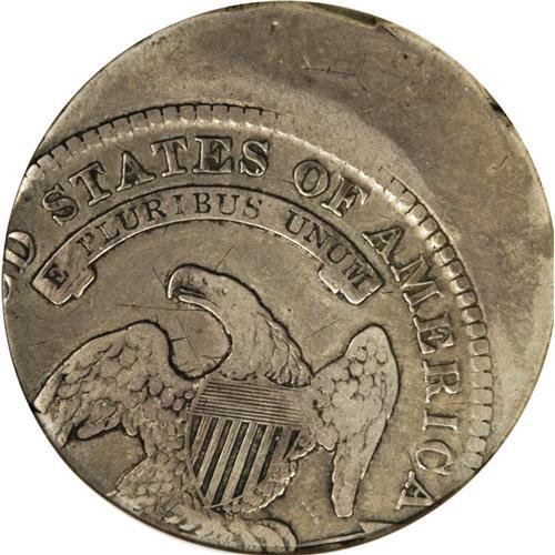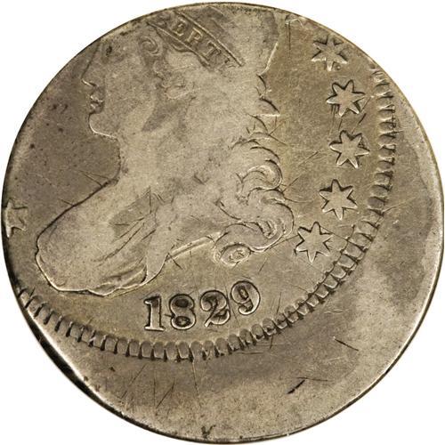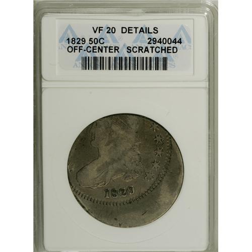 <B>1829 50C Bust Half--Off Center, Scratched--ANACS. VF Details.</B></I> O-112a, R.2. Struck about 25% off center toward 10:30. The denomination and most of UNITED are off the flan. This light tan-gray piece circulated despite the mint error, and a former recipient added several short, hair-thin marks on each side.<BR><BR><b>Shipping:</b> Coins & Currency (<a target="_blank" href="http://www.heritageauctions.com/common/shipping.php">view shipping information</a>)