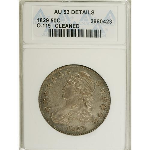 <B>1829 50C --Cleaned--ANACS. AU53 Details.</B></I> O-119. NGC Census: (57/527). PCGS Population (54/457). Mintage: 3,712,156. Numismedia Wsl. Price: $233. (#6154)<BR><BR><b>Shipping:</b> Coins & Currency (<a target="_blank" href="http://www.heritageauctions.com/common/shipping.php">view shipping information</a>)