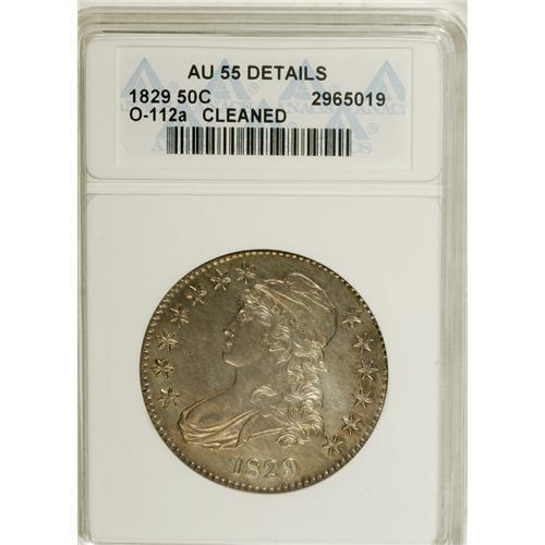 <B>1829 50C --Cleaned--ANACS. AU55 Details.</B></I> O-112a. NGC Census: (101/429). PCGS Population (128/332). Mintage: 3,712,156. Numismedia Wsl. Price for NGC/PCGS coin in AU55: $300. (#6154)<BR><BR><b>Shipping:</b> Coins & Currency (<a target="_blank" href="http://www.heritageauctions.com/common/shipping.php">view shipping information</a>)