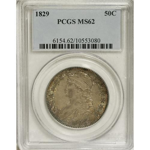 <B>1829 50C Large Letters MS62 PCGS.</B></I> O-110a, R.2. Lovely chestnut-gold and jade-green dominate this nicely struck half dollar. The reverse border also displays glimpses of cherry-red. An attractive representative of Overton-110a, which is significant as the only Large Letters variety of the date.<BR><BR><b>Shipping:</b> Coins & Currency (<a target="_blank" href="http://www.heritageauctions.com/common/shipping.php">view shipping information</a>)
