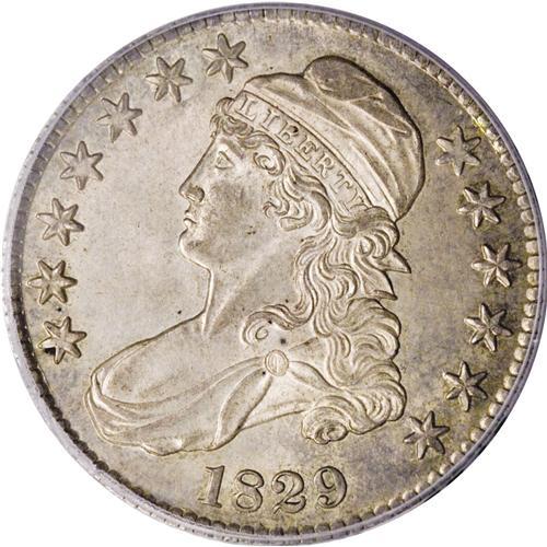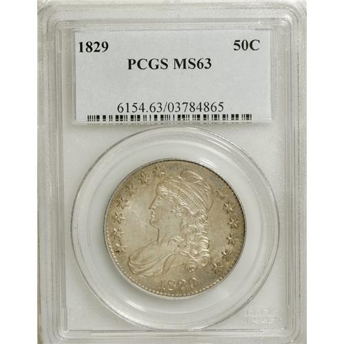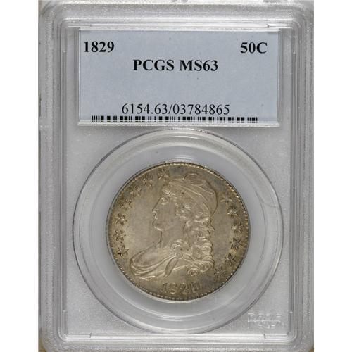 <B>1829 50C MS63 PCGS.</B></I> O-105, R.1. The upper arrow shaft shows recutting and passes through the lower olive leaves, and the C in the denomination is weak and close to the stem of the olive branch. On the obverse, star 7 points to the top of the curl. Much luster remains on this coin, despite the presence of some light yellow-gray patina. Faint, scattered abrasions account for the grade.<BR><BR><b>Shipping:</b> Coins & Currency (<a target="_blank" href="http://www.heritageauctions.com/common/shipping.php">view shipping information</a>)