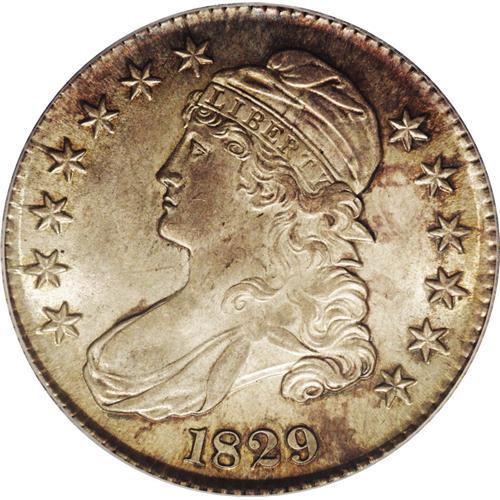 <B>1829 50C MS64 ICG.</B></I> O-108a, R.3. Intermediate die state lacking the parallel lines in front of the bust and with a partially, but not quite completely filled final A in AMERICA. One could easily come to the conclusion that this process is advanced enough for an O-108a attribution. The strike is well executed save for normal weakness on several of the hair tresses. Tinges of orange-gold toning cling to the borders.<BR><I>From The Westmoreland, Virginia Collection.</B></I>