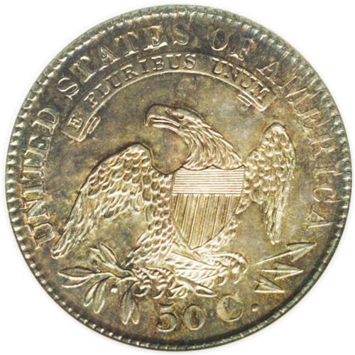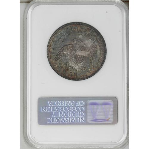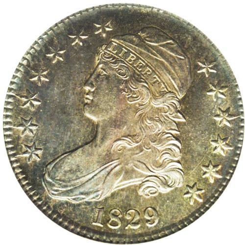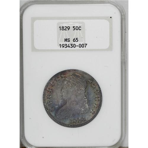 <B>1829<50C> MS65 NGC.</B></I> O-105a, R.1. Dramatic aquamarine and orange-gold toning dominates this well struck and unmarked Capped Bust half. A prize for the toning enthusiast. From late dies with the outer star points drawn to the border, and the arrow shafts are missing near the claws. Housed in a prior generation holder.