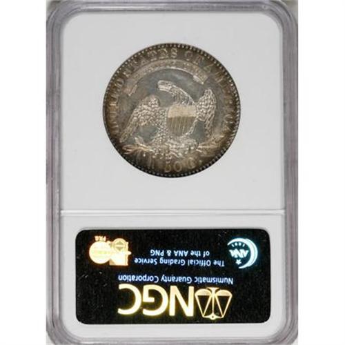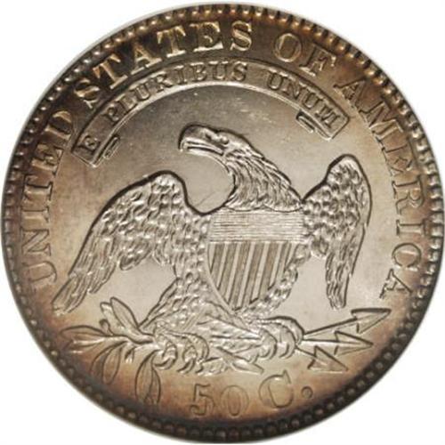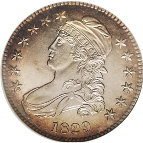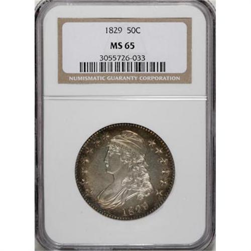 <B>1829 50C MS65 NGC.</B></I> O-119, R.2. An easily attributable variety that shows several crossbars that extend into the right wing and recutting on the upper left part of A1. Sharply defined in all areas, the satiny surfaces are brilliant in the centers with golden-brown toning around the peripheries. While relatively available in AU and Uncirculated grades, this Gem is certainly one of the finest, if not <I>the </B></I>finest example known. <BR><BR><B>Coin Engraver:</B> John Reich<BR><BR><b>Shipping:</b> Coins & Currency (<a target="_blank" href="http://www.heritageauctions.com/common/shipping.php">view shipping information</a>)