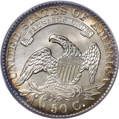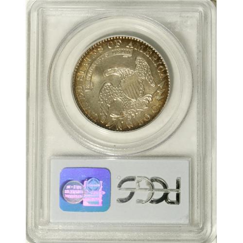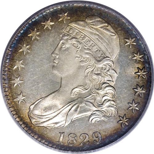 <B>1829 50C MS65 PCGS.</B></I> O-111, R.2. The right side of the 9 in the date is recut, and on the reverse, the letters STATE are recut to the left, and it is this combination of diagnostics that identifies this variety. The recutting on the reverse is clearly visible, and there is no evidence of die cracks or other die defects, except for a few light clash marks. This recutting also identifies the reverse as the same die used for O-119 of 1828. This is a lovely half dollar with prooflike fields and frosty devices on the obverse, and fully frosty and lustrous reverse surfaces. It is mostly brilliant save for light peripheral iridescence on both sides. Although it is a common variety, few Gem quality pieces exist, and this coin is certainly in the Condition Census of the top six known examples.<BR><I>From our 2005 FUN Sale, lot 30216.</B></I><BR><I>From The Rocky Top Collection of Bust Half Dollars.</B></I><BR><BR><b>Shipping:</b> Coin/Currency (<a target="_blank" href="http://www.heritageauctions.com/common/shipping.php">view shipping information</a>)