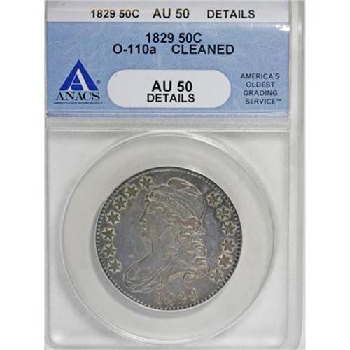 <B>1829 50C Small Letters--Cleaned--ANACS. AU50 Details.</B></I> O-110a. NGC Census: (48/4142). PCGS Population (93/533). Mintage: 3,712,156. Numismedia Wsl. Price for NGC/PCGS coin in AU50: $340. (#6154)<BR><BR><B>Coin Engraver:</B> John Reich<BR><BR><b>Shipping:</b> Coins & Currency (<a target="_blank" href="http://www.heritageauctions.com/common/shipping.php">view shipping information</a>)