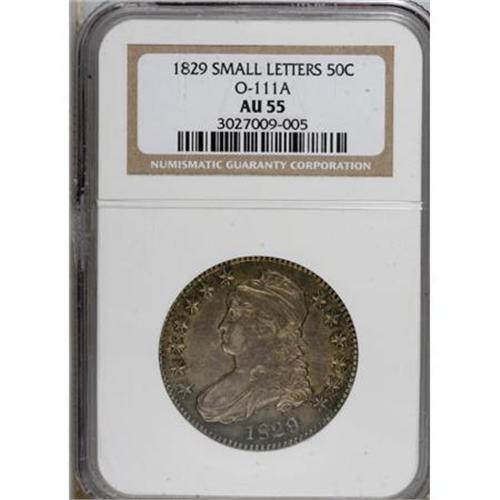 <B>1829 50C Small Letters AU55 NGC.</B></I> O-111A. NGC Census: (104/1719). PCGS Population (134/334). Mintage: 3,712,156. Numismedia Wsl. Price for NGC/PCGS coin in AU55: $300. (#6154)<BR><BR><B>Coin Engraver:</B> John Reich<BR><BR><b>Shipping:</b> Coins & Currency (<a target="_blank" href="http://www.heritageauctions.com/common/shipping.php">view shipping information</a>)