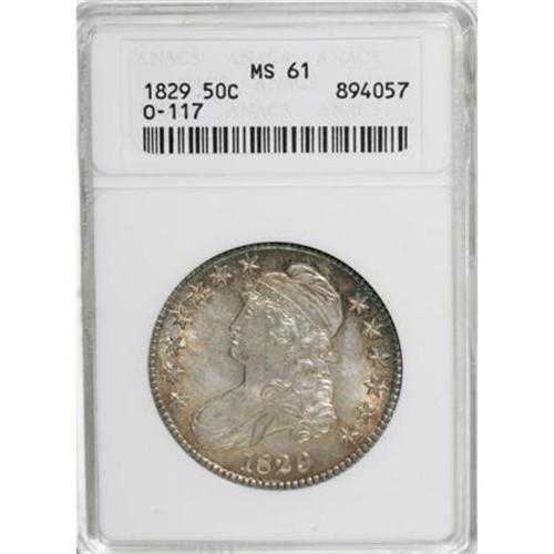 <B>1829 50C Small Letters MS61 ANACS.</B></I> O-117, R.2. Beautiful peach and electric-blue endow this lustrous and crisply struck silver half. A loupe reveals a few delicate hairlines that have no impact on the blatant eye appeal.<BR><BR><B>Coin Engraver:</B> John Reich<BR><BR><b>Shipping:</b> Coins & Currency (<a target="_blank" href="http://www.heritageauctions.com/common/shipping.php">view shipping information</a>)